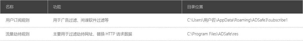 HTTP代理进程(ADSafe.exe)主要负责处理网络过滤驱动转发来的HTTP请求,根据不同的规则可以用于做广告过滤和流量劫持。ADSafe规则分为两个部分,分别在两个不同的目录下。规则目录位置及用途,如下图所示: