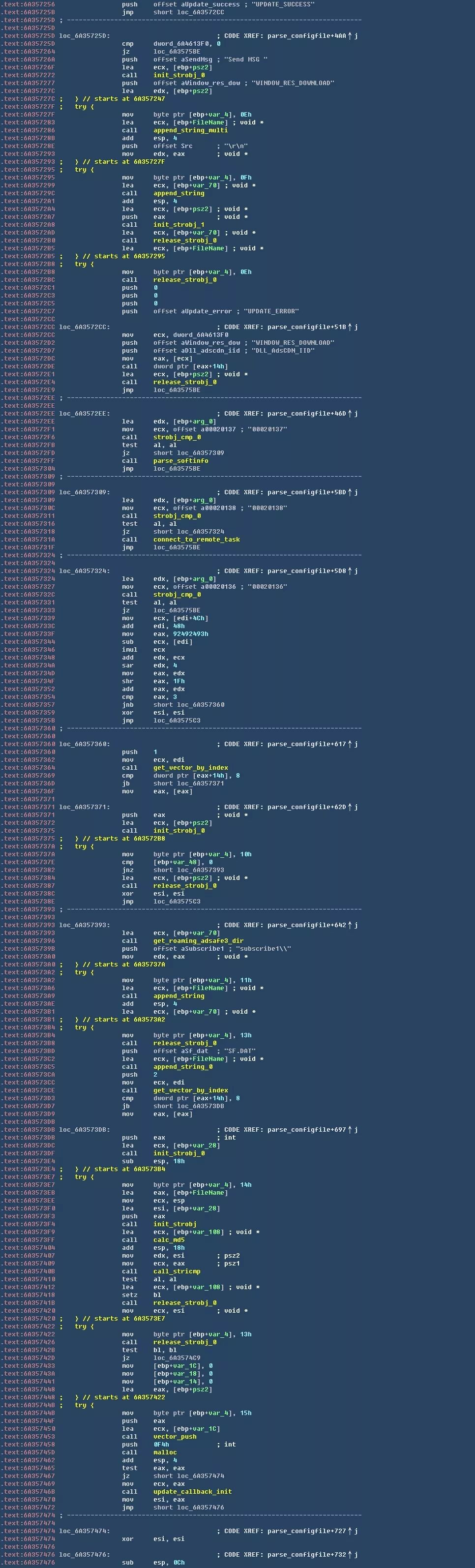 策略更新功能主要对应ADSafe中的AdsCdn.dll模块,该模块主要负责策略的请求、下载和解密流程。劫持策略更新流程首先会访问C&C服务器地址请求策略配置数据CdnJsonconfig.dat。C&C服务器地址,如下图所示: