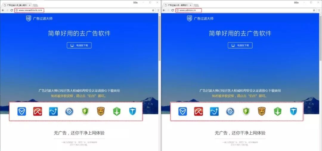 官网页面不但完全相同,且都带有多家安全软件的安全认证,如下图所示: