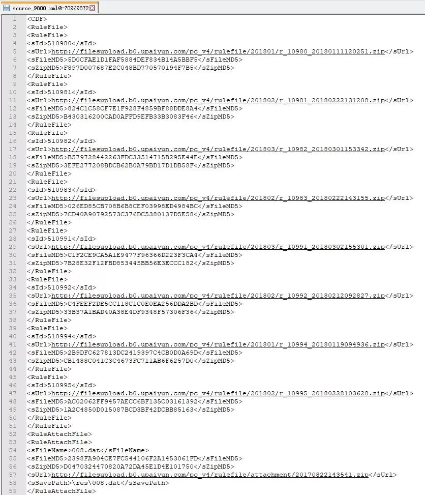 如上图所示,其中“0002020A”属性中存放的是策略更新配置文件下载地址(hxxp:// filesupload.b0.upaiyun.com/pc_v4/rulefile/source_9800.xml?-70969872),通过HTTP请求我们可以得到如下配置:
