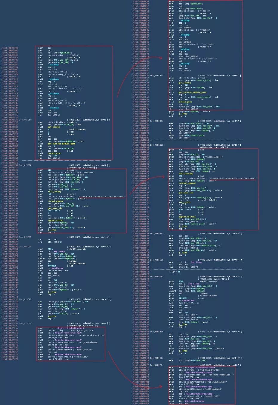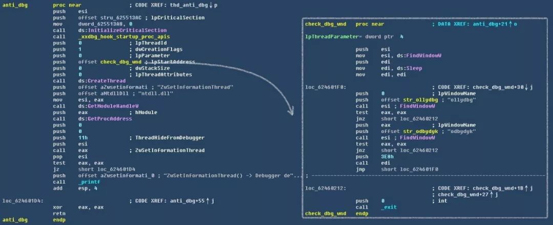 代理服务进程除了上述操作外,还会通过检测窗口名(OllyDbg等)、修改线程调试属性等方式进行反调试,相关代码如下图所示: