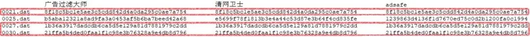 不但目录中文件名基本一致,而且用于流量劫持的数据SHA1也基本一致(只有0025.dat的SHA不同),三款软件也都同时包含有相同的功能模块。所以我们可以判断,三款软件同属于一家软件制作厂商。SHA1对比,如下图所示: