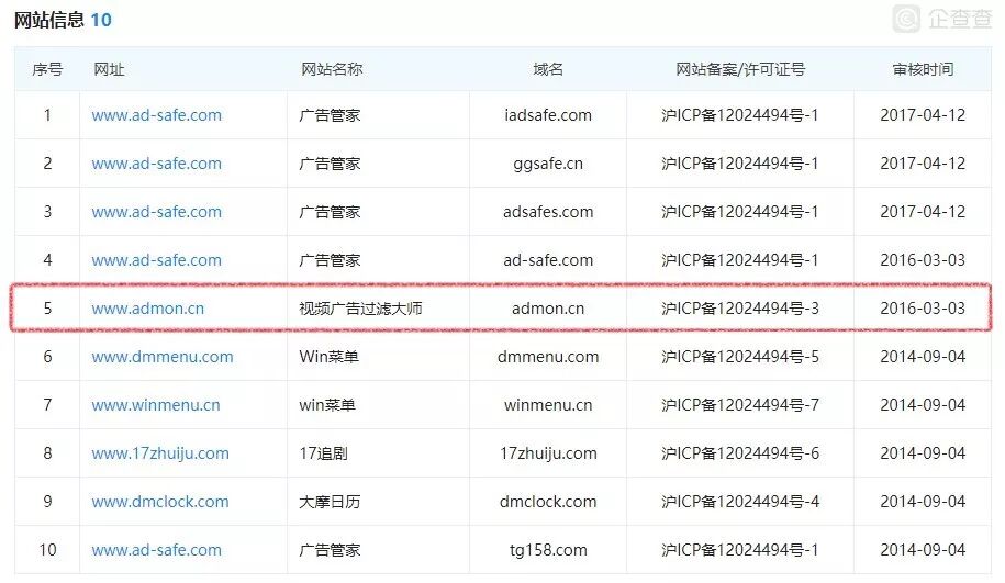 除了前文中所说的清网卫士外,我们还发现一个与ADSafe具有相同劫持策略及功能模块的广告过滤软件“广告过滤大师”。该软件有两个页面完全相同的官网,分别为hxxp://www.admon.cn/和hxxp://www.newadblock.com/,且“admon.cn”域名是由“上海大摩网络科技有限公司”注册的。如下图所示: