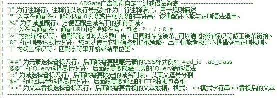 在流量劫持策略下发到本地之后,首先会进行解密,之后加载到HTTP代理服务中。为了方便我们下文中对劫持规则的说明,我们首先引用ADSafe过滤语法简表对过滤规则的关键字进行说明。关键字及相关用途如下图所示: