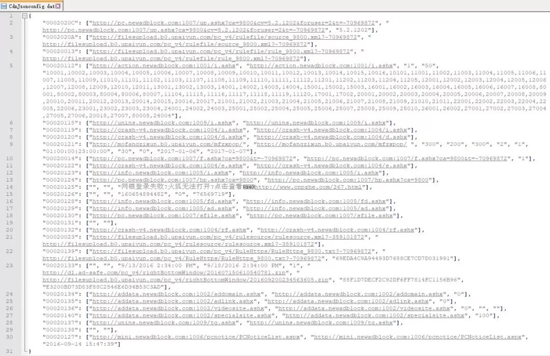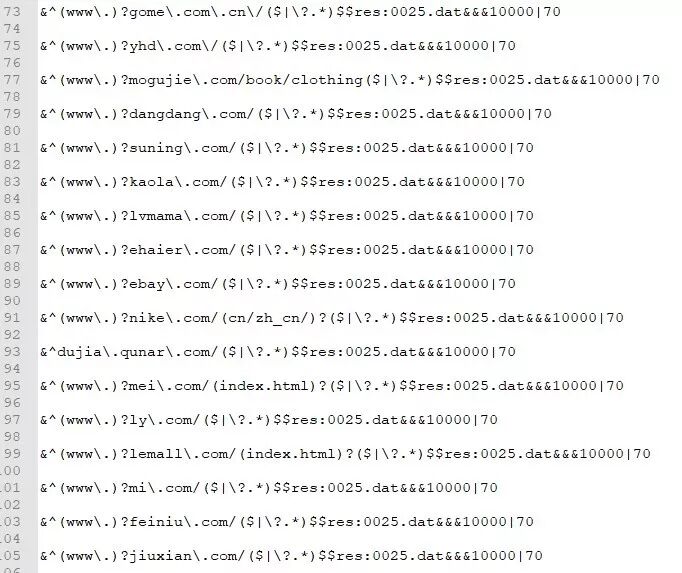 流量劫持策略被存放在ADSafe安装目录下的”res\tc.dat”文件中,经过解密我们可以得到劫持策略。部分劫持策略,如下图所示: