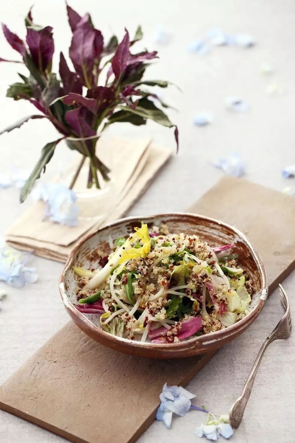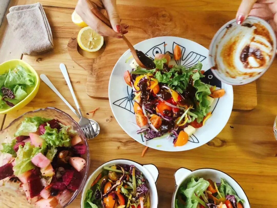 薏雯认为,饮食应该吃“全食物”,这样才会摄入到完整的营养。“如果我们以自然食疗里关于食物阴阳的理论来看,胡萝卜半截在土里是阳,半截和萝卜缨子在土壤外面是阴。但很多人在料理食物的时候只选用了其中的一部分,而浪费掉的另一半其实也可以食用并且营养丰富,所以事实上并没有享用到食物完整的营养。”五颜六色的绿豆面、南瓜、甜菜根、空心菜、海草、橙子落盘,没有噼啪作响的锅铲声,也没有五味杂陈的油锅气——五六个素菜在半小时里被端上桌。这正是康康拿手的“彩虹餐”。每餐或每天吃一道“彩虹”,意味着摄入的营养更均衡。