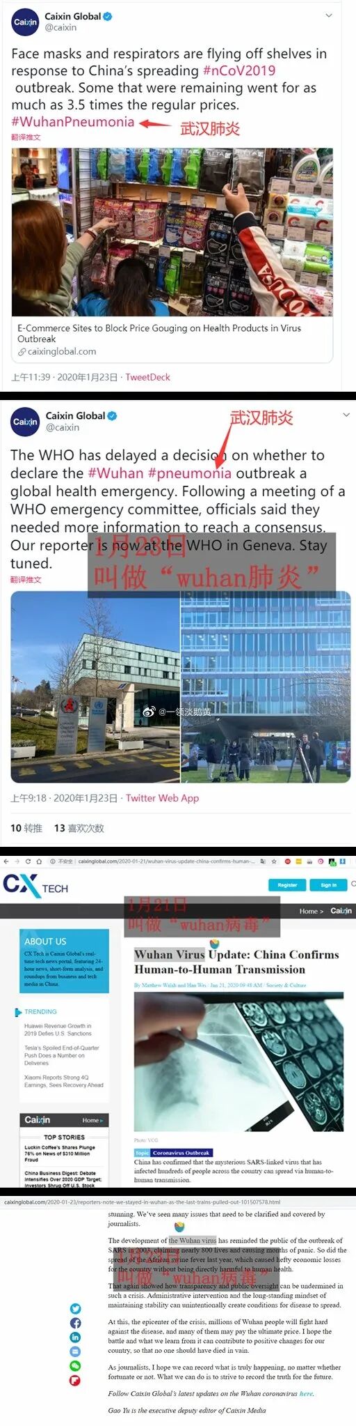 据@一领淡鹅黄 爆料,财新网不仅在新冠疫情早期多次使用‘武汉肺炎’等羞辱性称谓,在世卫组织为新冠肺炎命名之后的两周甚至更长时间,他们仍旧在自家的英文版网页上,我行我素地使用着‘武汉肺炎’。