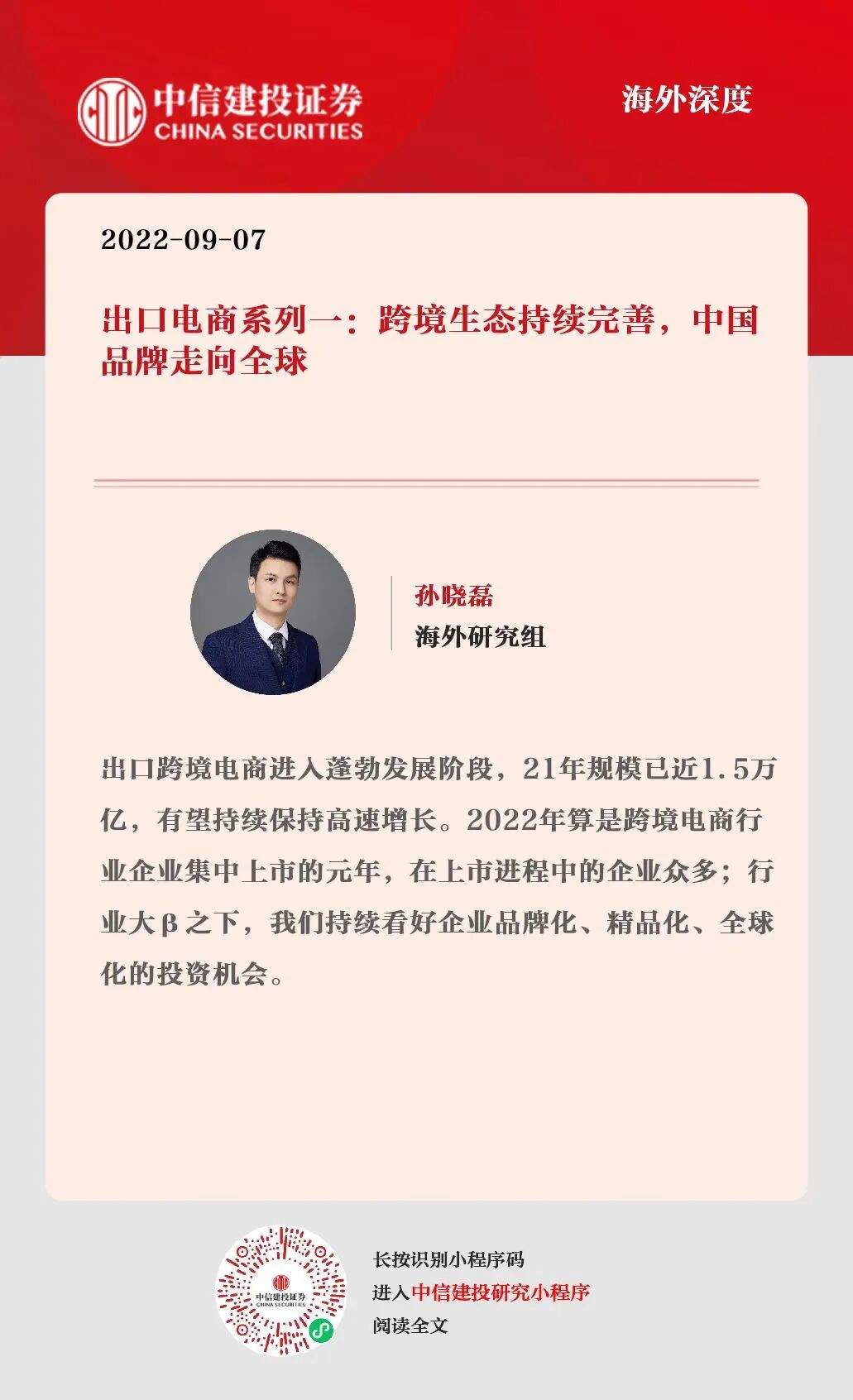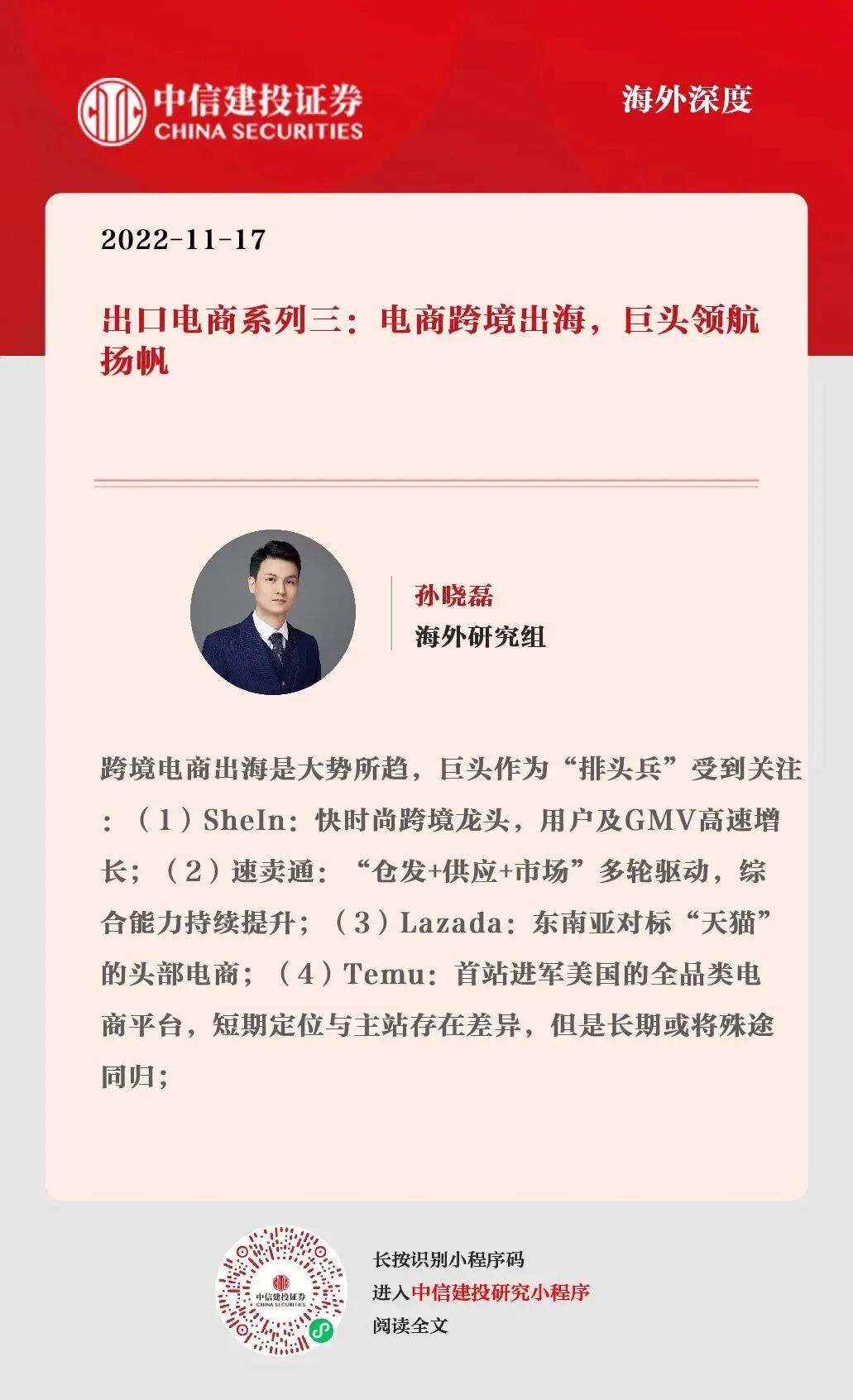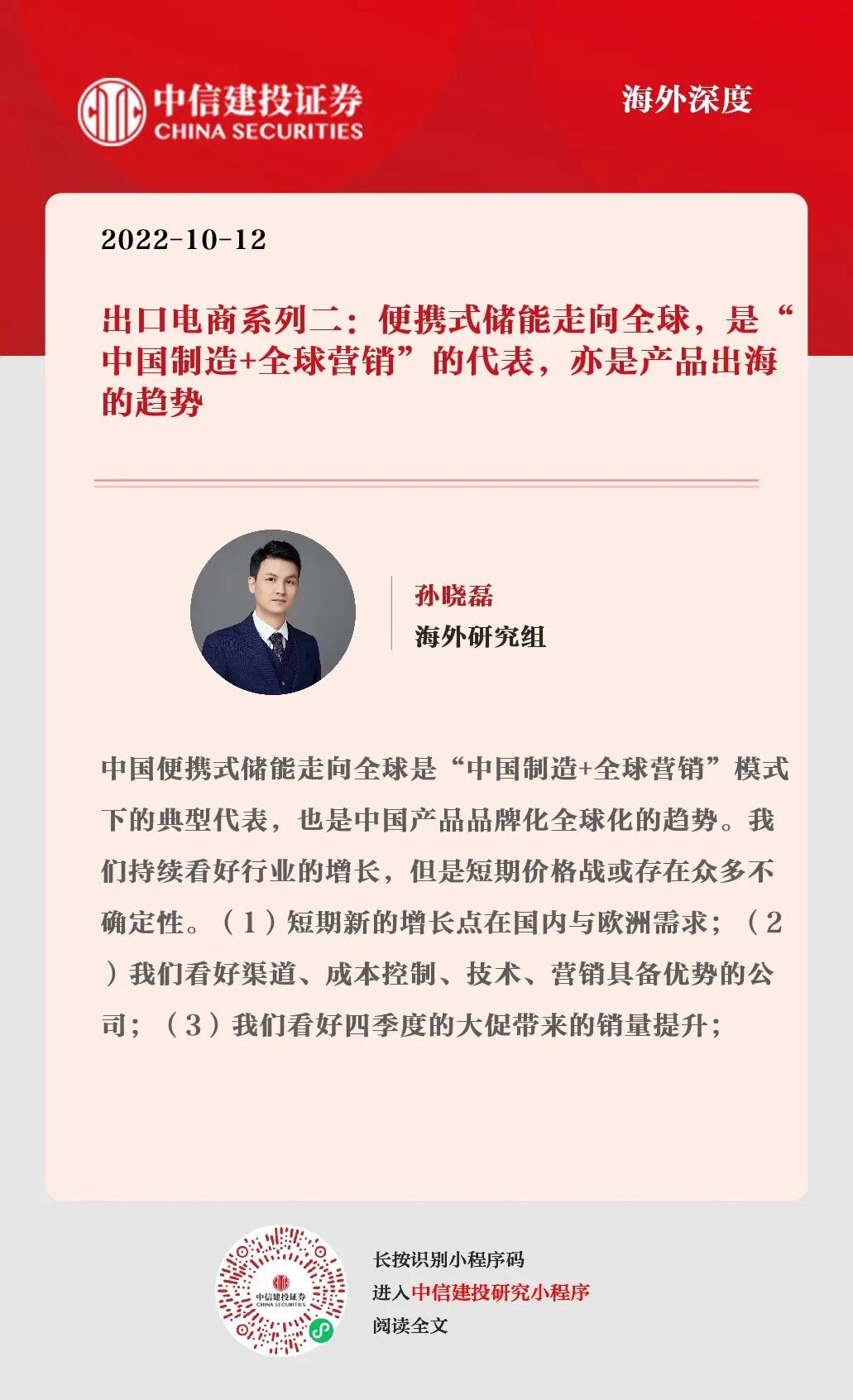 本订阅号不是中信建投研究报告的发布平台,所载内容均来自于中信建投已正式发布的研究报告或对报告进行的跟踪与解读,订阅者若使用所载资料,有可能会因缺乏对完整报告的了解而对其中关键假设、评级、目标价等内容产生误解。提请订阅者参阅中信建投已发布的完整证券研究报告,仔细阅读其所附各项声明、信息披露事项及风险提示,关注相关的分析、预测能够成立的关键假设条件,关注投资评级和证券目标价格的预测时间周期,并准确理解投资评级的含义。