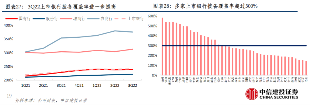 3Q22上市银行整体拨备水平继续提高,多家上市银行拨备覆盖率超过300%。3Q22上市银行整体拨备覆盖率为241.9%,季度环比上升1.6pct。具体来看,国有行、股份行、城商行3Q22拨备覆盖率分别季度环比上升1.2pct、1.2pct和8.9pct至240%、222%和313%,农商行拨备环比下行4.2pct,依然处于高位。