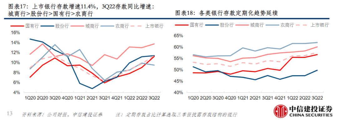 各类银行三季度存款增长保持上半年较好态势。3Q22上市银行总存款同比增长11.4%,较一季度提升1.7pct。3Q22国有行、股份行、城商行、农商行总存款分别同比增长11.3%、11.4%、13.7%和9.5%,除农商行小幅下降外,增速均较二季度继续提升,增速环比变动2.2、0.2、0.8、-0.4pct。