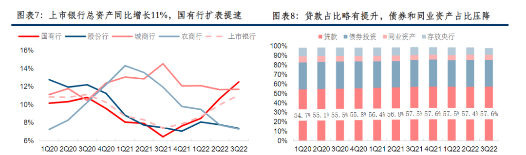 稳增长持续发力,上市银行资产规模增长再提速。3Q22上市银行总资产同比增长11%,较二季度提升1.1pct,板块表现略有分化,国有行扩表速度继续加快,城商行增速基本与二季度持平,股份行和农商行增速小幅下降,3Q22国有行、股份行、城商行、农商行总资产同比增长12.5%、7.4%、11.7%、7.3%。