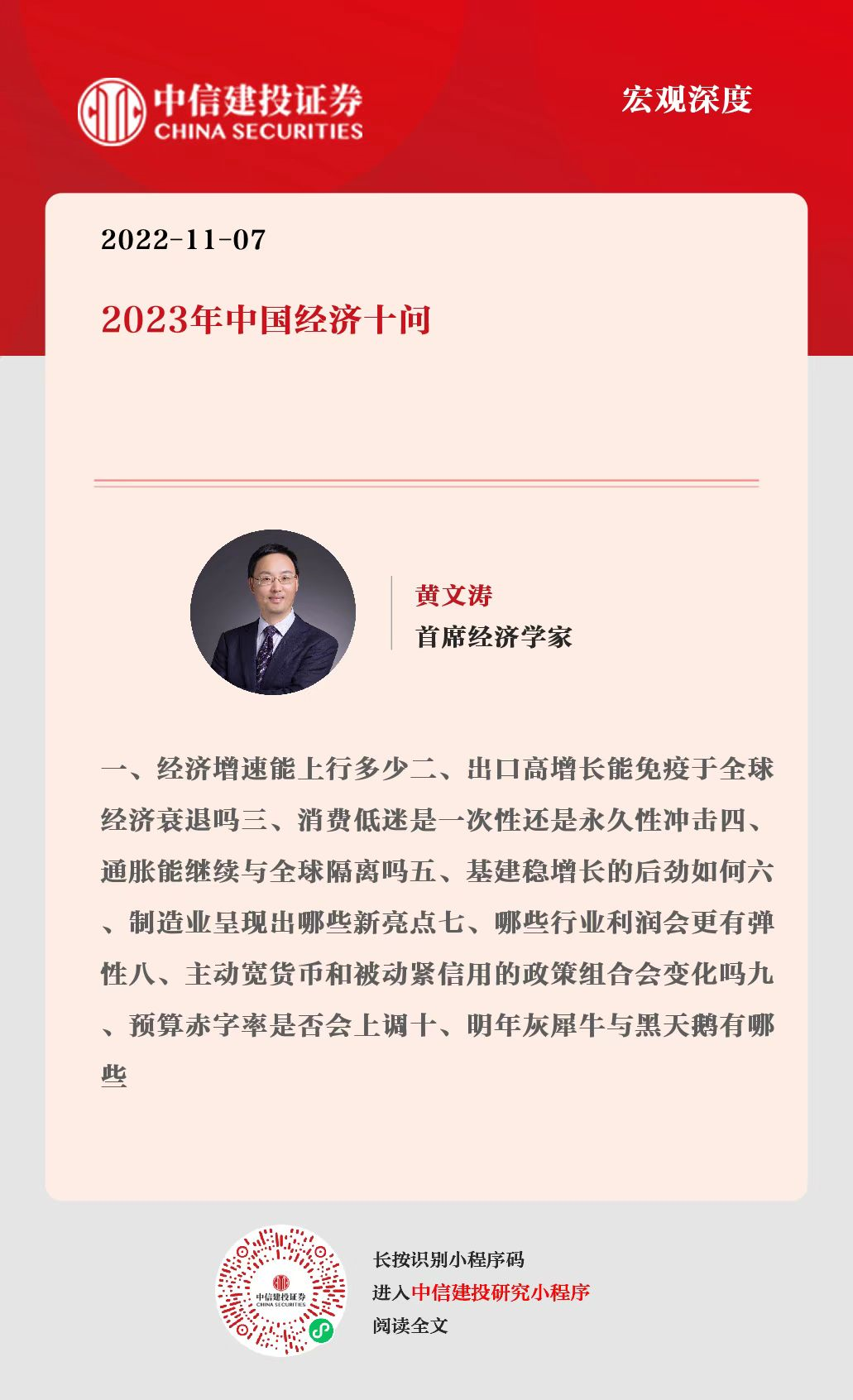 一、经济增速能上行多少 二、出口高增长能免疫于全球经济衰退吗 三、消费低迷是一次性还是永久性冲击 四、通胀能继续与全球隔离吗 五、基建稳增长的后劲如何 六、制造业呈现出哪些新亮点 七、哪些行业利润会更有弹性 八、主动宽货币和被动紧信用的政策组合会变化吗 九、预算赤字率是否会上调 十、明年灰犀牛与黑天鹅有哪些。