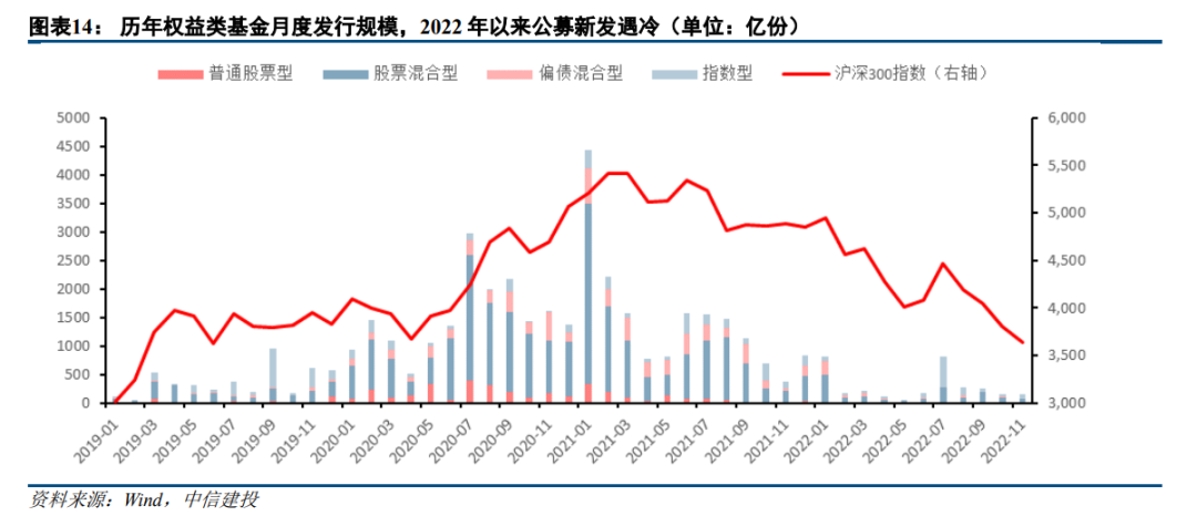 权益类公募基金是A股市场重要的增量资金来源,基金的发行往往与市场行情互为因果,2022年权益市场波动较大、赚钱效应不佳,导致公募基金新发遇冷。截至12月11日,普通股票型基金年内收益率中位数仅为-17.2%,公募基金投资体验大幅下降。总量上看,截至2022年10月末,股票型和混合型基金总体规模5.89万亿份,较年初增长1451亿份,其中6、10月份权益类公募基金面临较大抛压。新发规模上看,2022年至12月16日,权益类公募基金发行744只,规模约3273亿份,较去年同期大幅下降14157亿份,月均发行规模仅为273亿份/月。