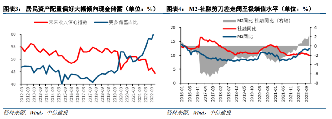 宽货币、紧信用组合下,剩余流动性反常高位。2022年以来流动性供给持续发力,货币政策、财政政策双积极,信贷支持力度强劲。但流动性的创造还受到资金需求方的约束,实体经济融资需求的持续偏弱,导致宽信用进程受阻,一度出现剩余流动性持续高位的异常现象。具体数据上来看,11月社融存量同比延续弱势下行至10%,M2同比进一步上升至12.4%,M2-社融增速剪刀差走阔至2.4%,创下历史新高。宽货币至宽信用传导路径不畅,宽松的流动性环境未能有效作用于分子端的盈利预期。此外,本轮充裕的剩余流动性也并未流入股市,而是在未来收入下降预期下转而流向储蓄体系。
