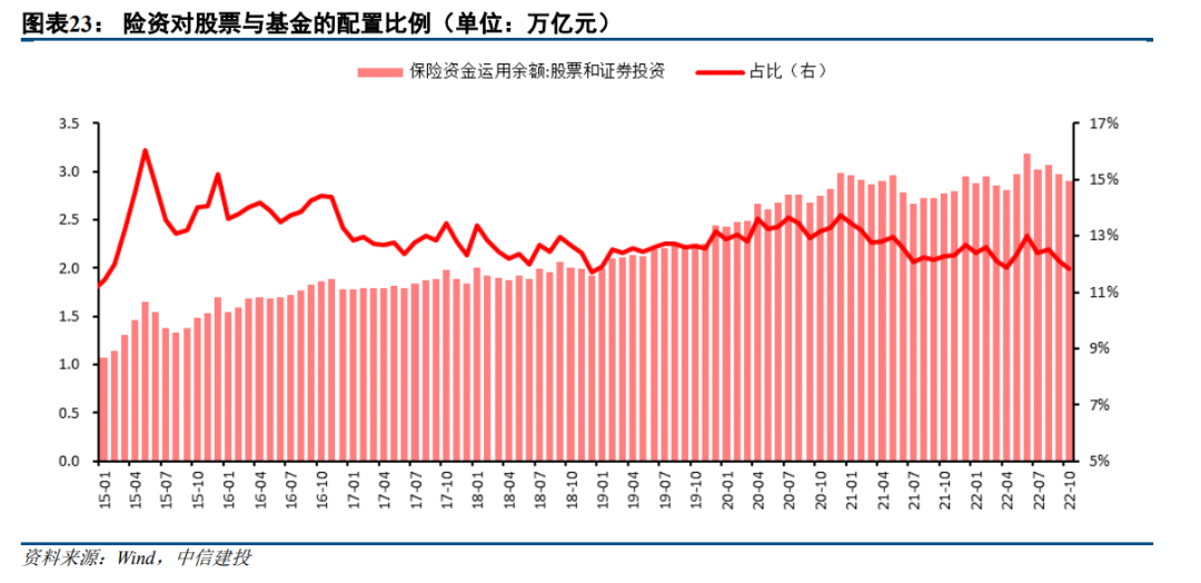 当前充分回调后A股配置性价比水平凸显,注重秉持长期价值投资理念的保险资金后续有望积极买入。今年以来,随着保费收入增速放缓,保险资金运用余额规模增速持续下滑,反映的是居民可支配收入增速的下降、疫情对销售活动的限制以及居民财富的分化。从部分大型保险公司今年半年报中的相关表述来看,对于权益资产配置依然较为谨慎。截至2022年10月份,险资运用余额较去年年末增长13110亿元,但险资对股票与基金的配置余额较去年年末减少452亿元,占比由12.70%下降至11.84%,已接近2018年年底时的低位。