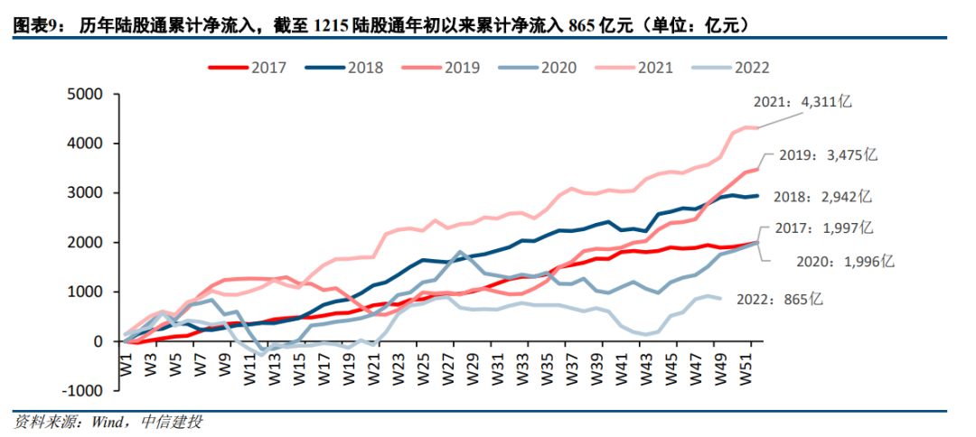 2022年1-11月陆股通月均流入规模在212亿/月左右,整体流入较为悲观。考虑到利空出尽,外资流入规模有望向正常水平回归,参考19年、20年、21年的平均流入规模,预计2023外资全年净流入规模为3000亿左右。