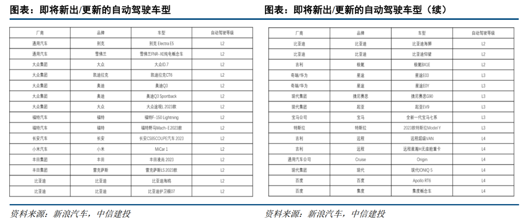 2023年新出自动驾驶车型中L2依旧为主流,L3/L4有望加快落地。2023年,多家车厂将推出L3级别自动驾驶汽车,从半自动驾驶阶段跨越至特定场景中完全自动驾驶阶段。例如,现代汽车将在2023年推出包括捷尼赛思G90和起亚EV9在内的多款L3级别自动驾驶汽车;宝马L3自动驾驶系统“Personal Pilot”将在2023年底推出,并将在宝马7系列上使用;小米纯电汽车搭载L3级别自动驾驶系统,目前正处于测试阶段,预计2024年上半年将量产;奇瑞与华为将合作在2023年推出搭载L3级别自动驾驶系统的E03与E0Y。部分自动驾驶汽车车厂直接跳过L3,直接从L2迈向L4级别。例如通用公司旗下的Cruise支持L4级别驾驶,推出Origin车型;百度发布Apollo RT6,支持L4级别自动驾驶,并将于2023年开始试运营。