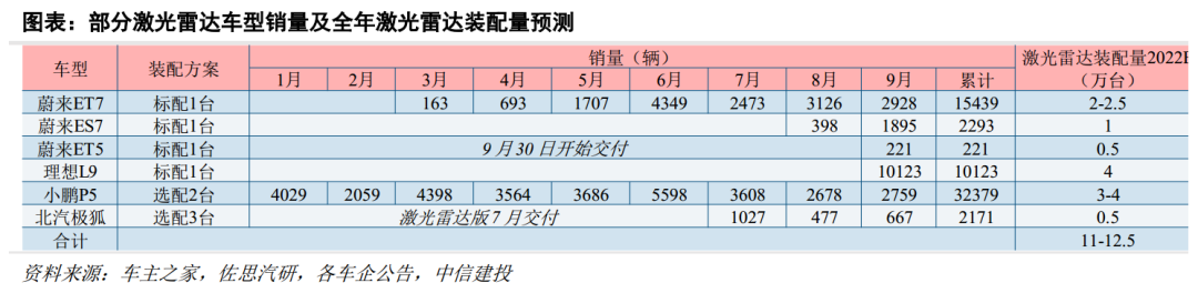 预计2022年国内激光雷达装配量超10万台,2023年持续增长确定性大。8月以后汽车市场进入传统销售旺季,综合历史销量数据和交付指引,预计3款蔚来系车型、理想L9、小鹏P5和北汽极狐2022年装配的激光雷达数量合计超过10万台。具体举例来看,理想L9标配1台激光雷达,按9-12月保持1万台车/月交付量的假设,则激光雷达装配量4万台;小鹏P5非标配激光雷达,整体销量无法和激光雷达装配量建立联系,根据佐思统计的上半年1.84万台的交付量,预计全年装配量3-4万台。除此以外的大部分激光雷达车型从四季度开始交付,考虑到前几个月的交付量往往处在爬坡阶段,预计贡献的装配量有限。随着现有激光雷达车型逐步进入正常销售节奏,同时伴随几款新车型在明年开启交付,预计2023年激光雷达装配量持续增长,并有较大概率实现翻倍增长。