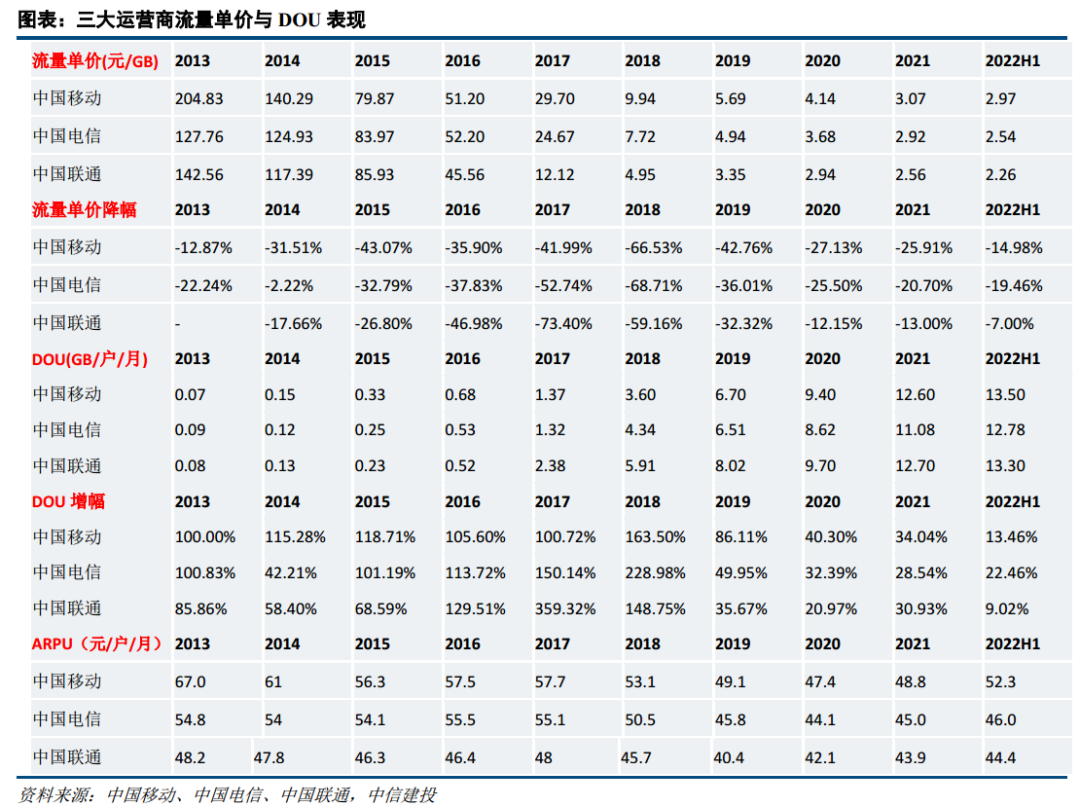 2019年来随着提速降费政策放松、竞争理性,运营商经营明显改善。在资费降幅收窄,DOU保持增长背景下,移动用户ARPU值企稳提升。2022年10月,中国移动、中国电信、中国联通5G套餐用户数分别为5.72亿户、2.57亿户、2.05亿户,渗透率约为58.72%、65.08%、59%。5G用户DOU、ARPU值高于整体移动用户水平。如中国移动2022H1 5G用户ARPU值为85元,DOU 21.5GB,而全部移动用户ARPU为52.3元,DOU 13.5GB。因此随着用户向5G迁转,对ARPU值拉动仍将持续,我们预计运营商未来2-3年移动ARPU值仍或持续提升。
