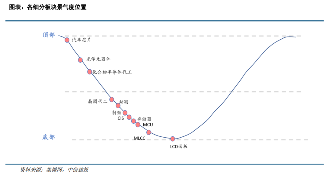 产业链各环节探底节奏:由于供需结构和库存去化节奏不同,产业链各环节底部拐点位置有异。我们认为从目前来看,库存及价格触底顺序可能依次为:LCD面板、被动元器件——射频器件、CIS、封测、存储、MCU——晶圆代工、光学元器件。