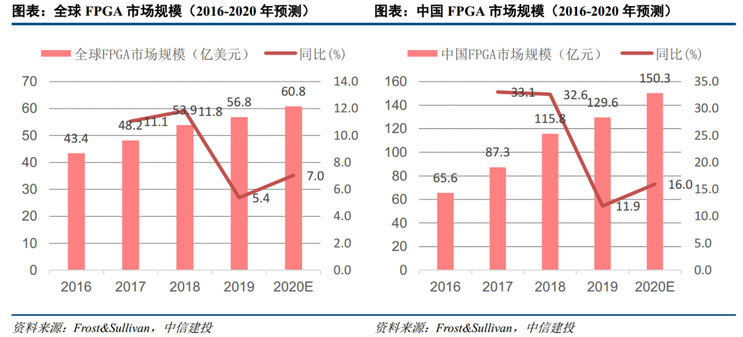 全球市场快速增长:根据Frost&Sullivan数据,2019年全球FPGA芯片产业规模约为56.8亿美元,2016-2019年复合增速为9.38%。随着全球新一代通信设备部署以及人工智能与自动驾驶技术等新兴市场领域需求的不断增长,FPGA市场规模预计将持续提高。中国市场增速快于全球市场:根据Frost&Sullivan数据,中国FPGA市场从2016年的约65.5亿元增长至2019年的129.6亿元,复合增速为25.48%。