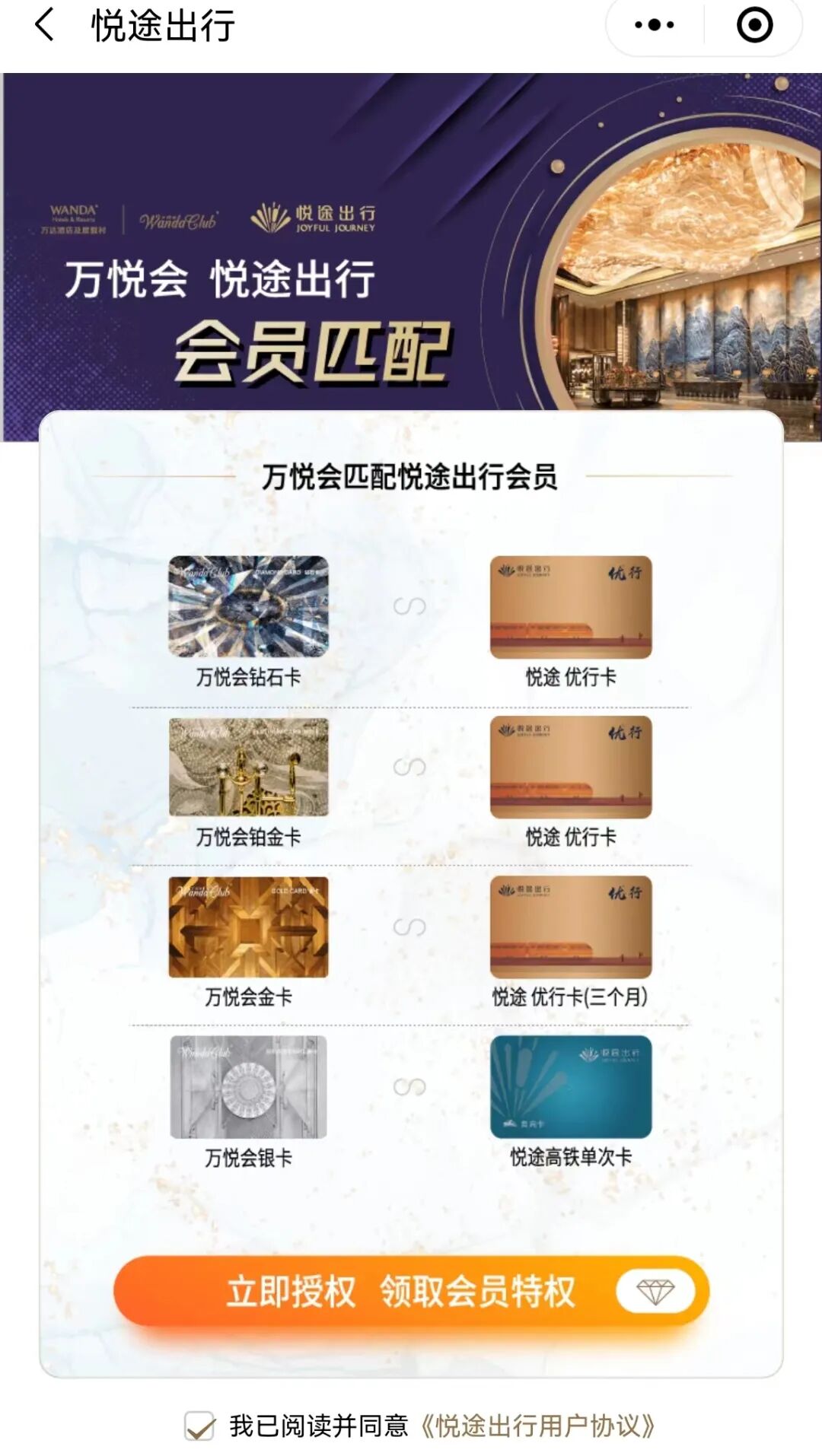 万悦会小程序高端会员匹配悦途出行高端会员(万达铂金和钻石匹配悦途优行卡,一年内无限次高铁贵宾厅)。点击下图: