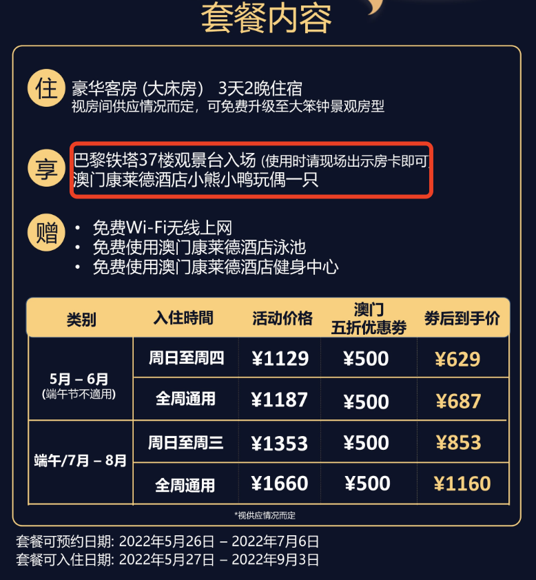 最低629元两晚的康莱德还可以给小熊小鸭玩偶一只,旁边的巴黎铁塔也可以免费去参观。暑假的周末去住也才1160两晚,还是非常适合囤着带娃去澳门玩的,说不准就用上了。这么便宜的康莱德可能也就是在澳门能住到了吧!