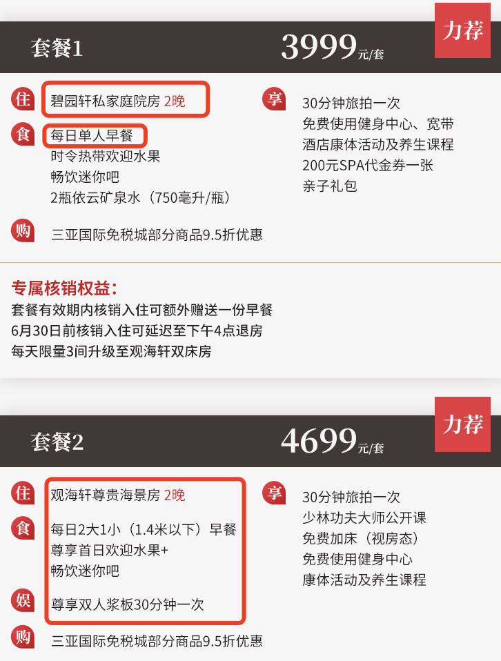 2988元两晚海景房包含早餐+1000元餐饮消费券+每日2嘉宾轩礼遇+首晚迷你吧1份+悦趣营+家庭旅拍体验1次+12岁儿童免费加床+免税店95折优惠