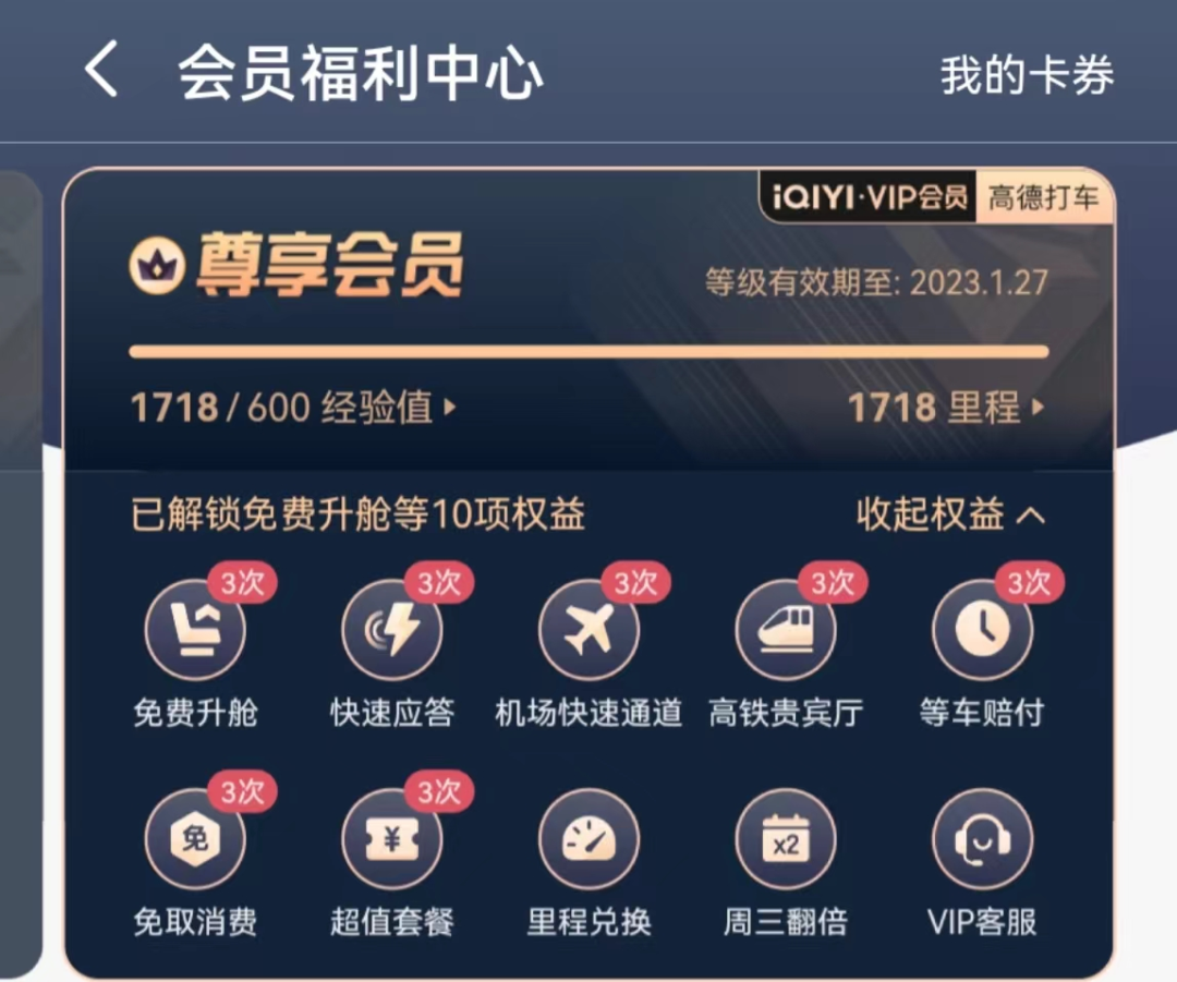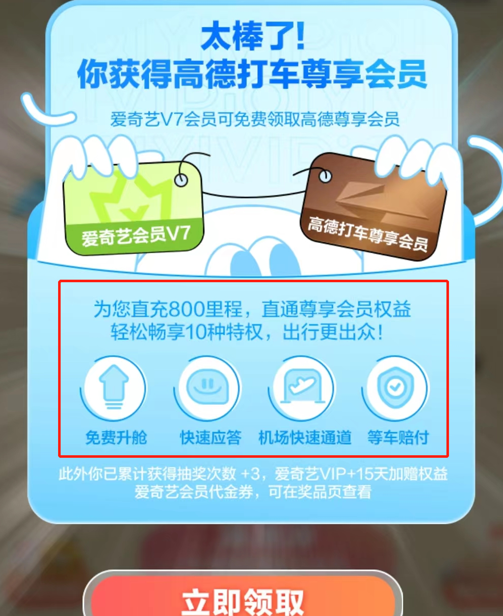 爱奇艺V1-V4会员领高德黑金,V5-V7领高德尊享。