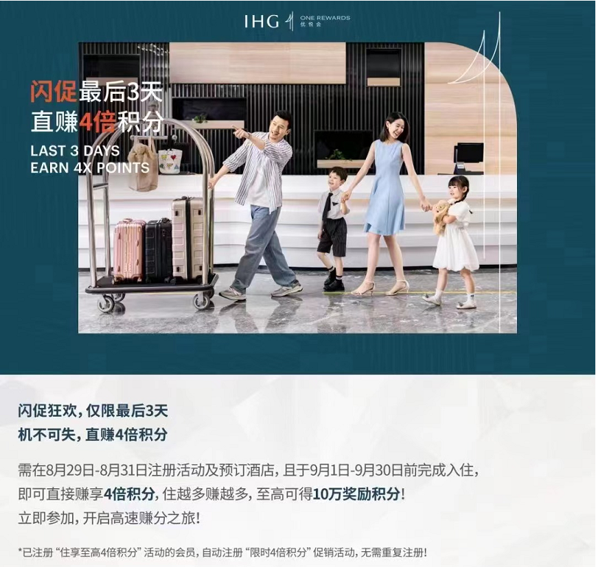 提前预告,“限时4倍积分”闪促是8月29-8月31日注册并预订、9月1日-30日完成入住直接享4倍积分奖励。即一晚入住直接赚4倍积分。