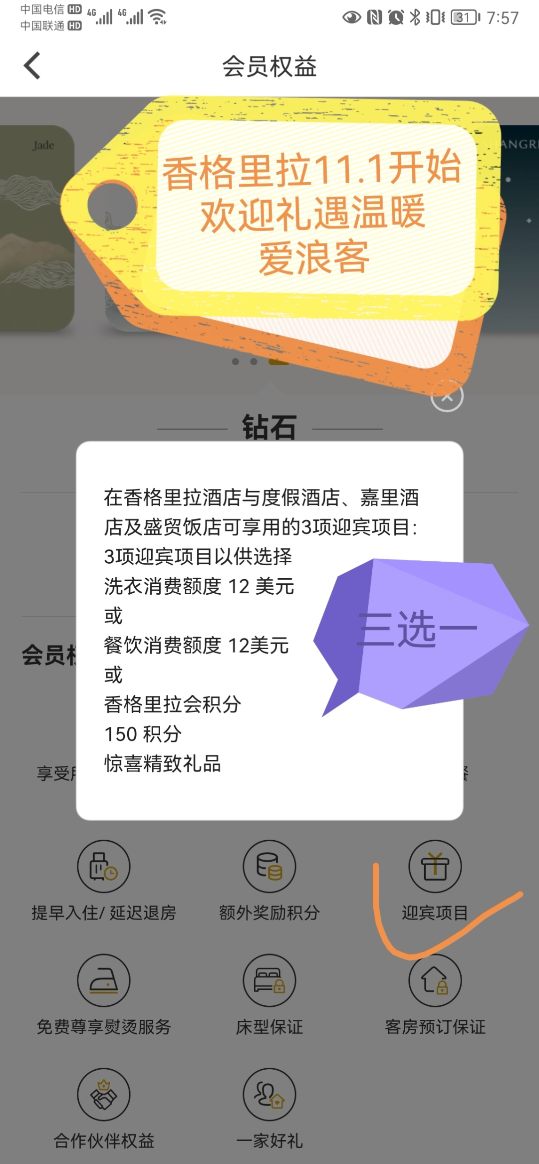 预计11.1开始,香格里拉会员欢迎礼遇要改革。钻石卡以前的三件套改为“三选一”,不过现在美元很贵,12美元还挺值钱的: