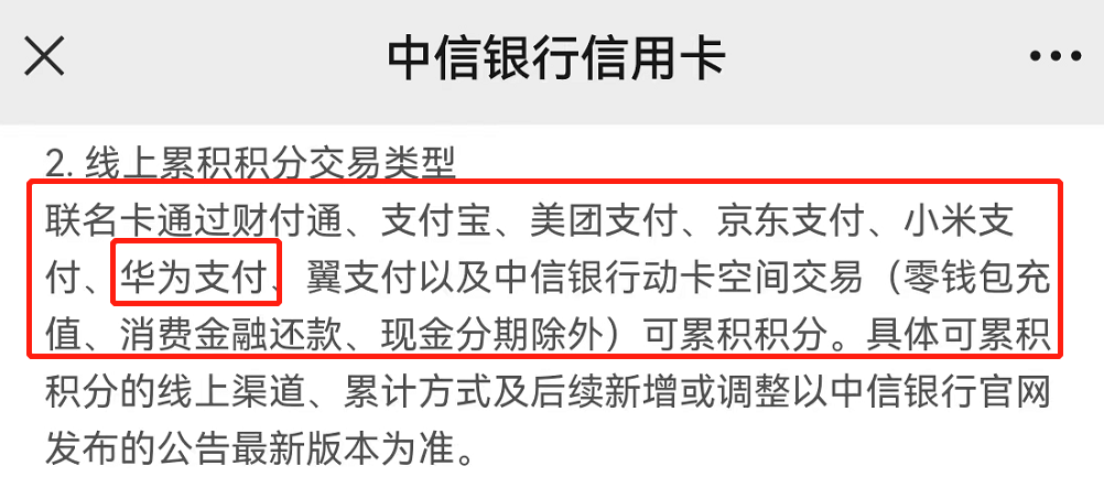 主要是线上累计积分渠道中的华为支付。中信万豪卡宣传页面是这么写的: