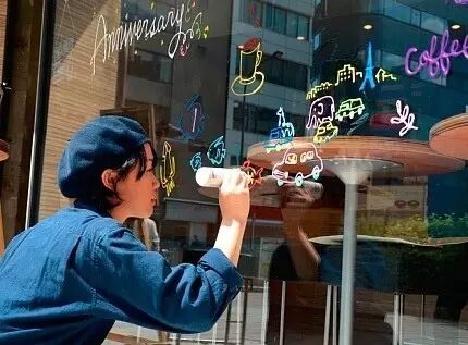 设计师确实可能发现一些不一样的角度。针对水系涂料干燥后可成膜、可调色的特性,在不需要过多额外投入的情况下,小关隆一在太洋涂料产品基础上,为其开发出一个新产品线:一款面向普通消费者的绘画工具——Masking Color。这个产品最常使用的场景是店铺的窗户装饰。相比颜料而言,Masking Color 无需手持颜料盘与画具,可以单手操作。笔头的扁平设计,可用来对线条进行调整。