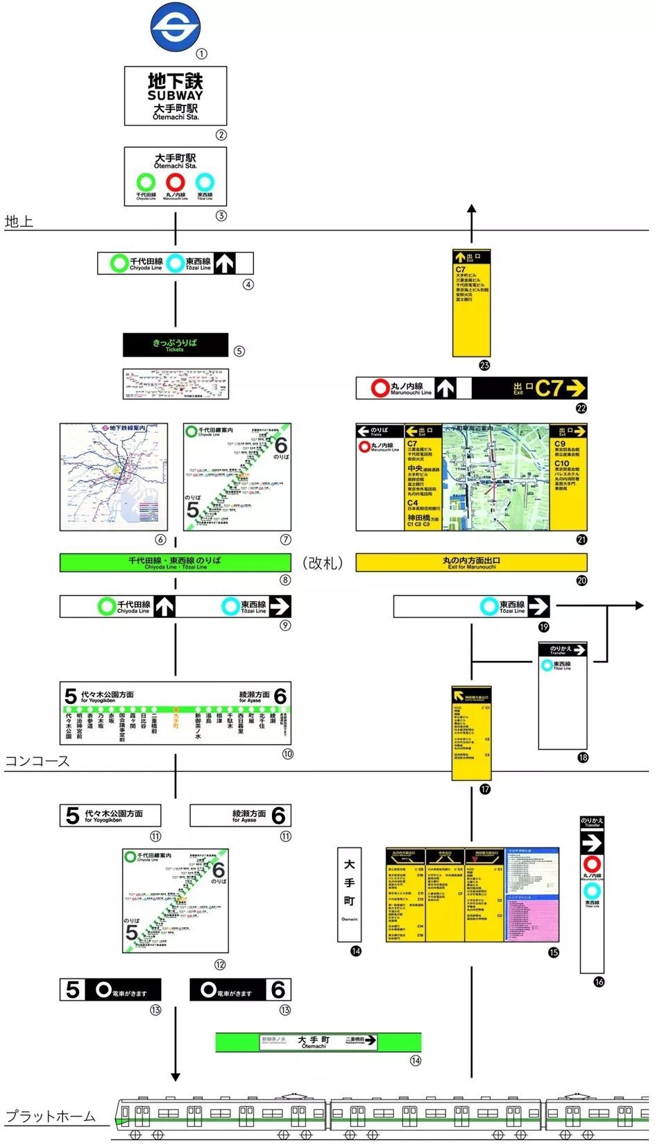 第一个任务是大手町站,我尝试把车站的指示牌统一并加入方向指示和图解标志。比如,把入口标志统一成绿色,出口标志统一成黄色,线路标志统一成线路名加各线路的彩色圆圈,出口处加上周边区域的地图和各出口对应建 筑的图解。大手町站的设计取得成功后,地下铁的其他车站也开始改造。
