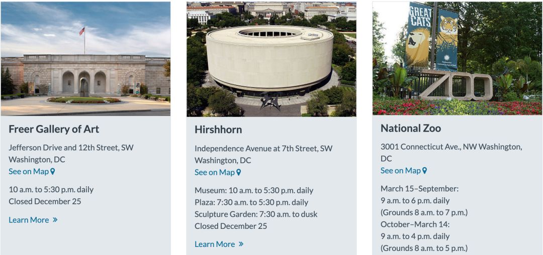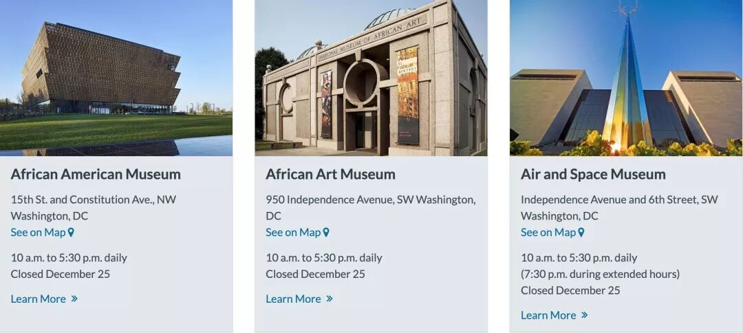 等等,看到列出的这些博物馆了吗?它们都是史密森尼学会(Smithsonian Institution)旗下的博物馆。管理着 19 家博物馆、9 个研究中心和 1 座动物馆的史密森尼学会,是全球最大的博物馆群和科研联合体。