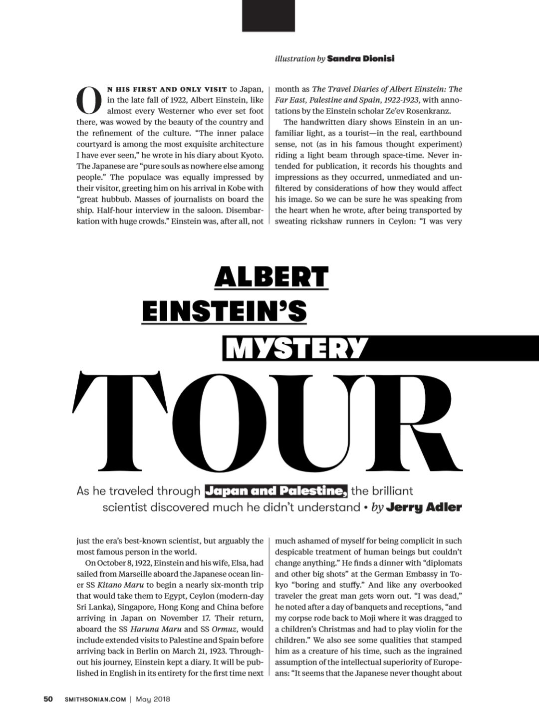 “阿尔伯特・爱因斯坦第一次也是唯一一次访问日本是在 1922 年的深秋,他认为日本人难以捉摸:“大部分日本人孤独地生活,勤奋地学习,友好地微笑着,但没有人能看透这种带着防备心的微笑背后隐藏的真实情感。”摘自封面故事之一《阿尔伯特·爱因斯坦的神秘之旅》,这些故事让人们看到了那个天才科学家与常人无异的一面。图片来源 |《Smithsonian》