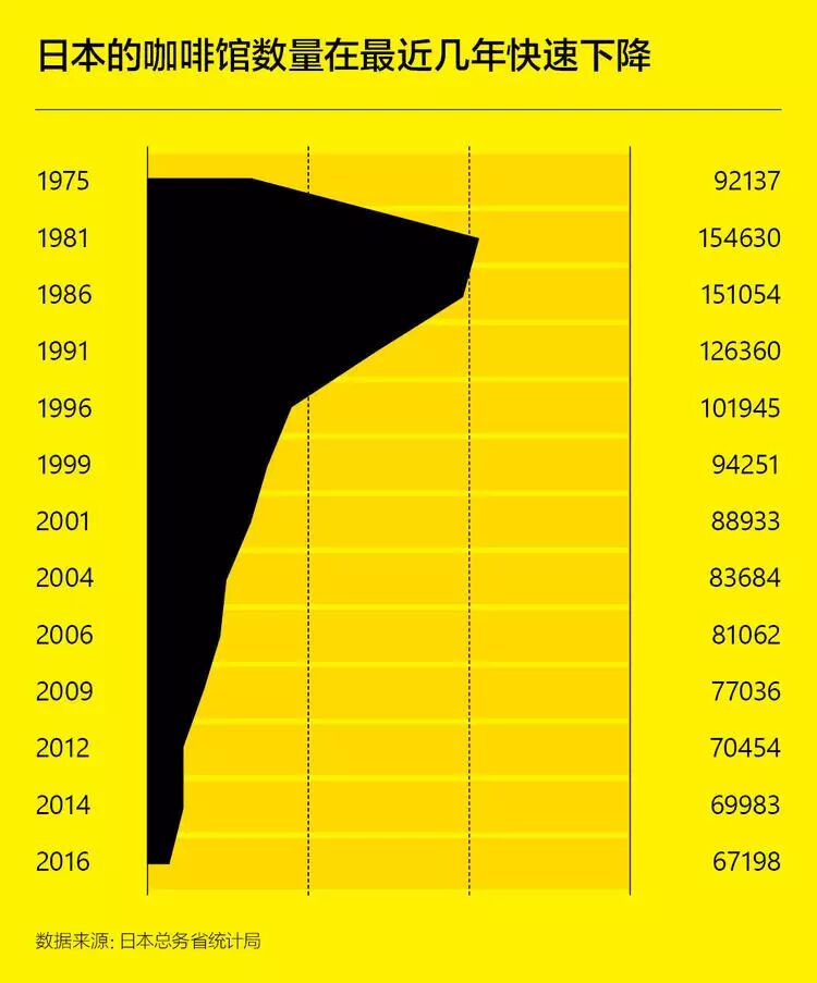 不过最近,咖啡的统治地位似乎没那么厉害了。根据日本财经杂志《President》的报道,日本的咖啡店数量从 1991 年的 12 万家减少到 2016 年的 6 万多家。