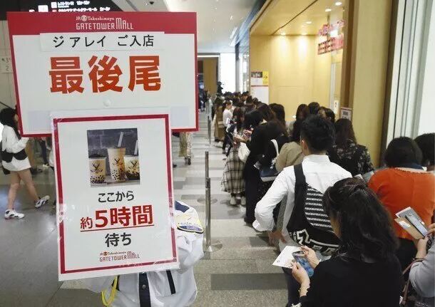 7 月 12 日,日本网友 Alter_despair 在 Twitter 上传了一张奶茶品牌鹿角巷在名古屋门店的照片。工作人员举着大大的指示牌,上面写着“需要等待 5 小时”。过了几个小时后,Alter_despair 又更新了一张照片,指示牌上的数字变成了“6”。大约从日本平成年代的尾声( 2019 年年初)起,“タピオカ”(源自英语 tapioca,意为木薯,是用来制作“珍珠”的原料,现为日语中珍珠奶茶的代名词)成了日本最流行的消费品。