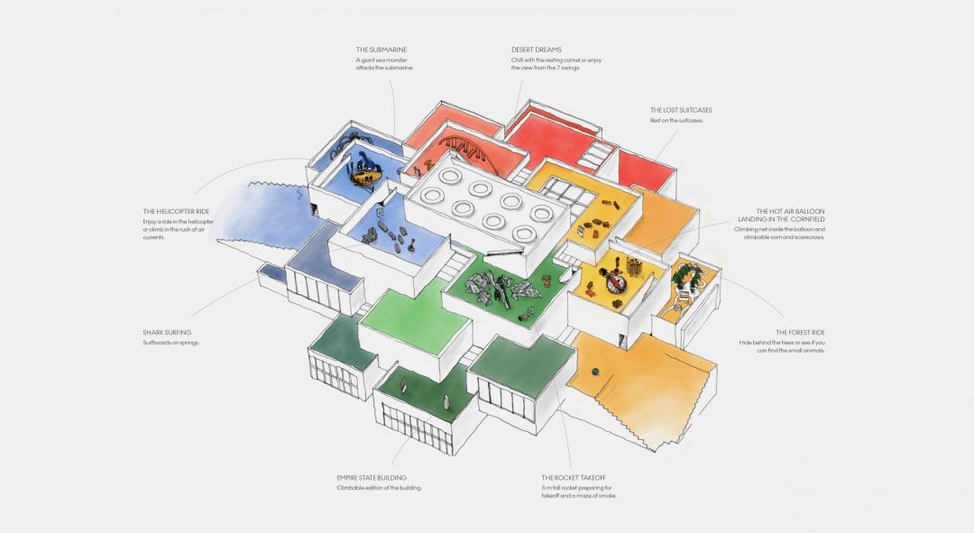2017 年,MONSTRUM 接到了另一个“大活”。在乐高积木的诞生地——丹麦比隆小镇,乐高公司建造了一个大型室内乐园,乐高之家(LEGO House)的建筑主体由 12 块不同颜色的巨型积木组成,顶层却“光秃秃”的。MONSTRUM 为屋顶设计出 9 个游乐场,名为“前往乐高之家的旅程”(The Journey to LEGO House),意在表现 9 种造访乐高之家的方式。