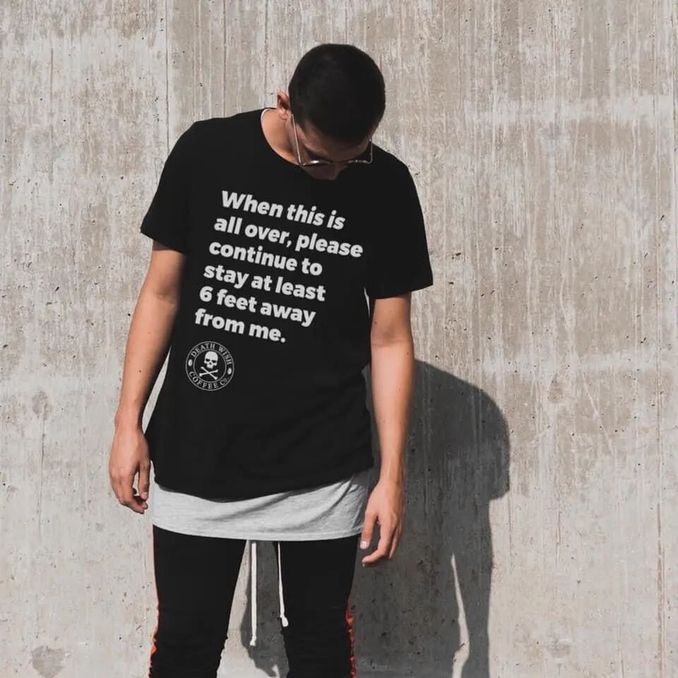 擅长造梗,还能帮助筹款。疫情之下,Death Wish Coffee 特别上线了一款 T 恤,并将短梗印在 T 恤的正面:“当这一切结束,请继续保持离我 6 英尺远”。这件售价 25 美元的 T 恤目前获得了 113 个评论和平均 5 星的好评。T 恤售卖所得利润,Death Wish Coffee 计划捐给因疫情失去工作的纽约市民。