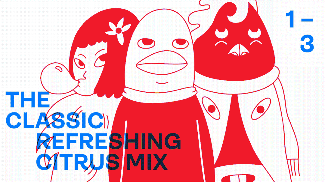 Our Friends in London 选择用最直观简单的方式,提取日本国旗的红色和法国国旗的蓝色,以高饱和度的双色设计体现出富有现代感的品牌视觉,并邀请美国洛杉矶的插画师 Andy Busc 为不同的清酒风格分别创造卡通人物形象。