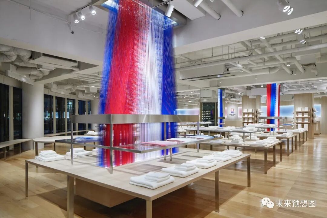 不仅如此,当时佐藤可士和在纽约旗舰店设计了整墙整齐堆叠彩色 T 恤的商品陈列方式,你应该也能在此后优衣库上海南京西路开业之初时使用的那套陈列方式里找到类似的思路。