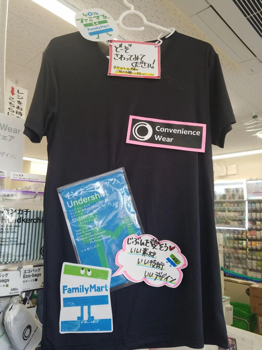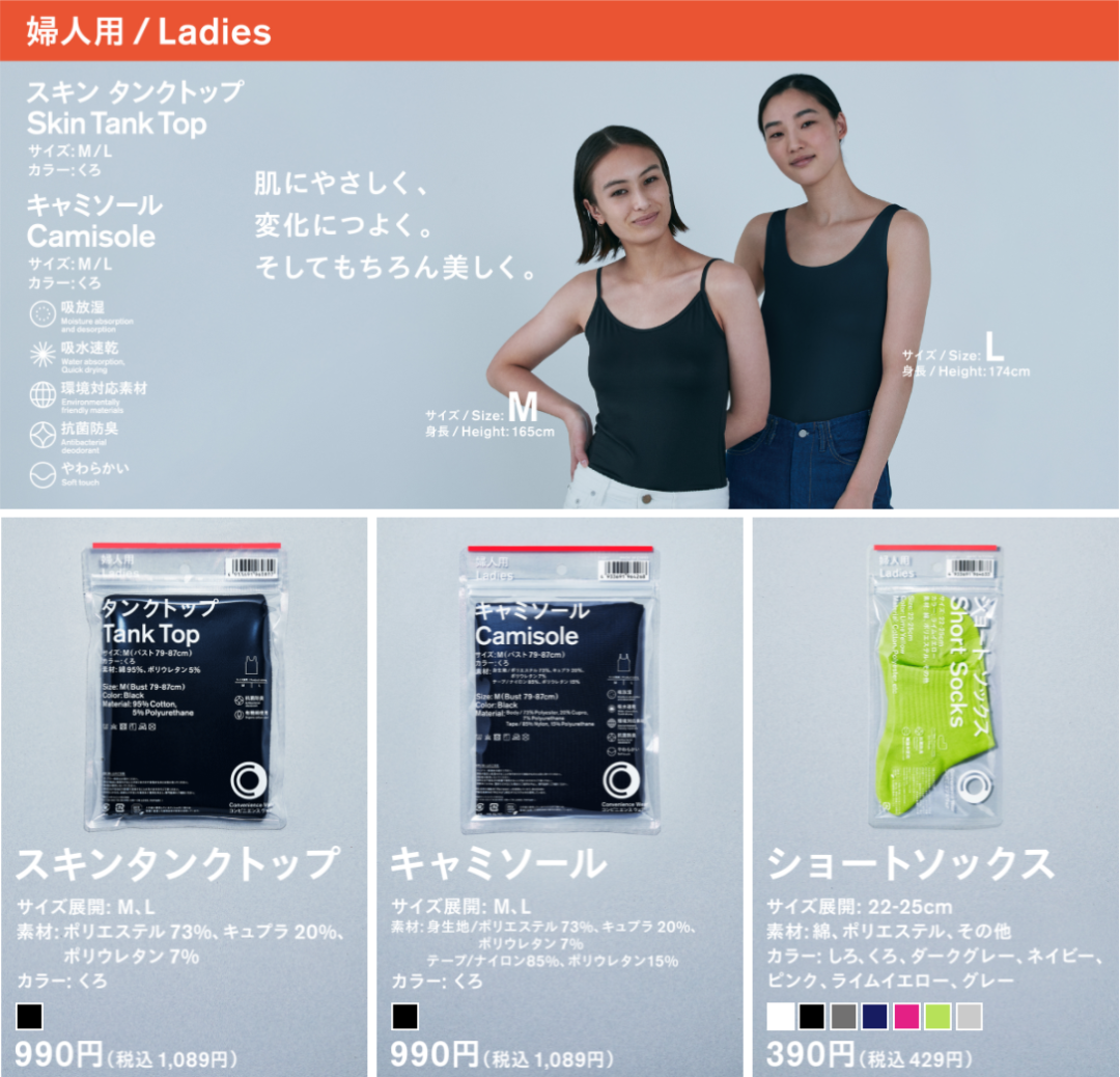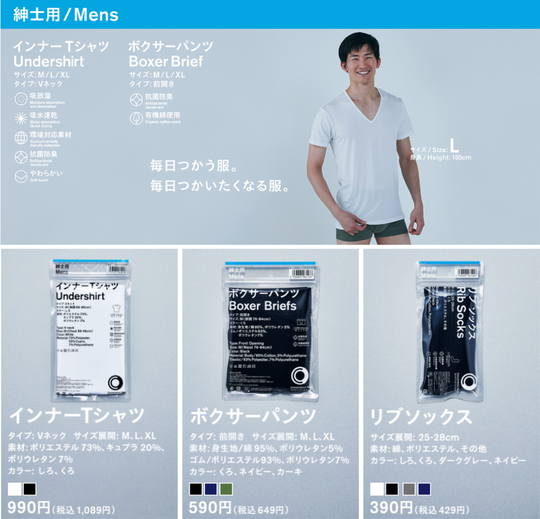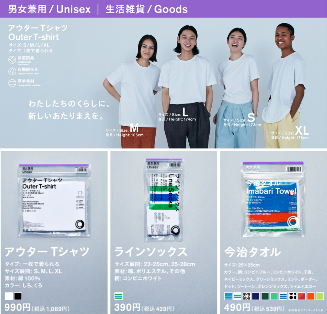 如果你能哼出全家便利店开门铃声、背出“全家就是你家”的广告语,不妨留意一下这件事:3 月 23 日起,日本的一些全家便利店上架了服饰系列“Convenience Wear”。这个系列共有 68 款,分成三大类:男女兼用(Unisex)的生活杂货以及女性用、男性用的服装,其中包括 T 恤、背心、裤子、内衣等,还有袜子和毛巾。