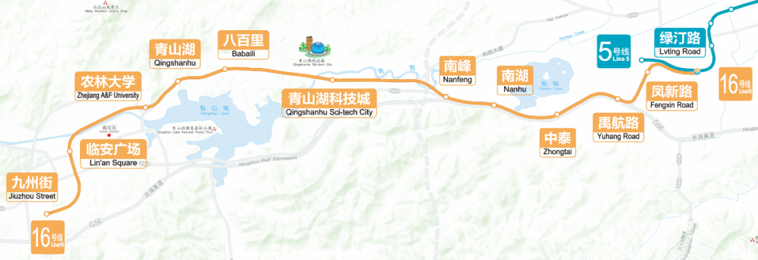 杭州地铁16号线西起临安锦南新城,东至未来科技城绿汀路,共设车站12座(8座地下站、4座高架站)。余杭境内的6个站分别为:南峰、南湖、中泰、禹航路、凤新路、绿汀路。