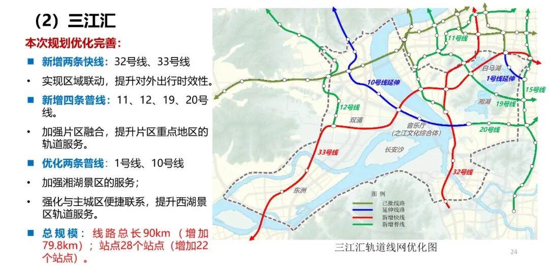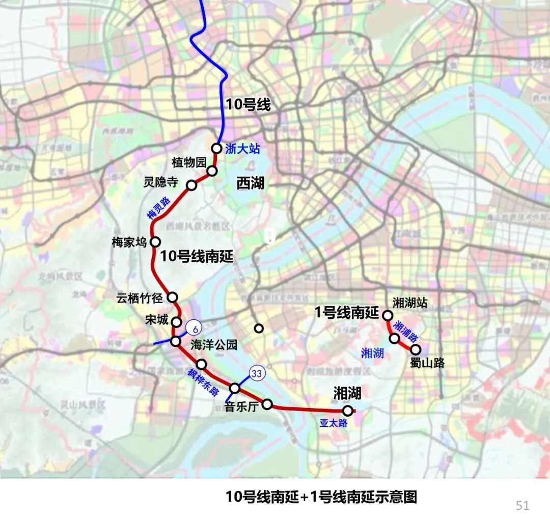从10号线浙大站出发,沿玉古路-灵隐路-梅灵路-枫桦路过江后延伸至湘湖南侧亚太路,长26公里,设站10座,提升景区轨道服务,强化三江口与主城核心区的便捷联系,同时促进三江口两岸融合发展。从1号线湘湖站,沿风情大道、湘浦路延伸至湘湖景区(蜀山路),长3.2公里,设站2座,加强对湘湖风景区的轨道服务。