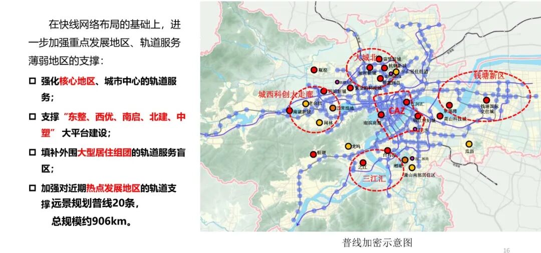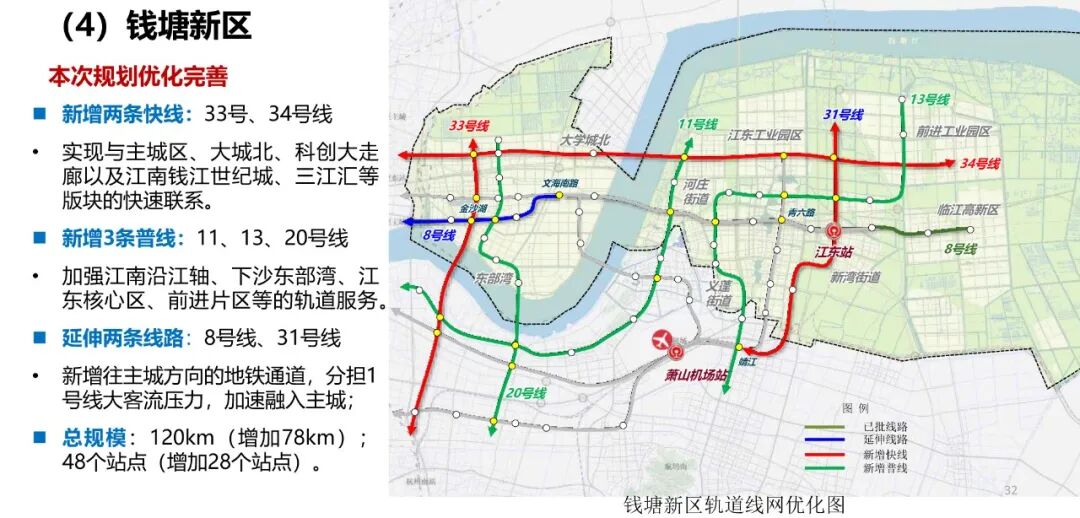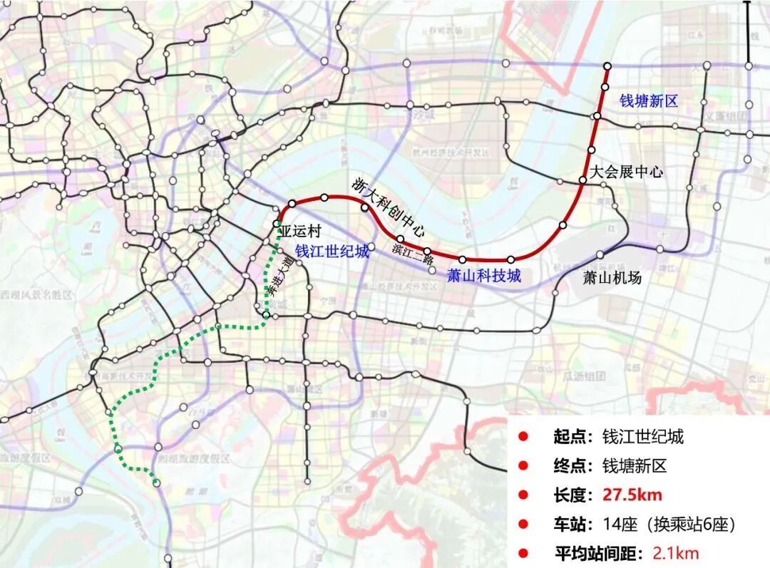 支持拥江发展的重要轨道走廊。串联钱江世纪城、萧山科技城、空港新城与钱塘新区沿江四大拥江发展重点片区,是江南拥江发展的重要轴线。提升CBD的对外辐射力,进一步加强钱江世纪城、亚运村的轨道覆盖。支撑重大项目发展,线路支持萧山科技城以及钱塘新区等重点地区发展。