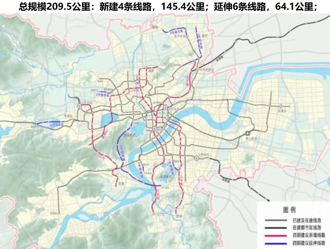 杭州地铁四期建设规划研究规模约 266.6 公里,共涉及 12 条线路,主要包含 5条新建线路和 7 条既有线路延伸线。