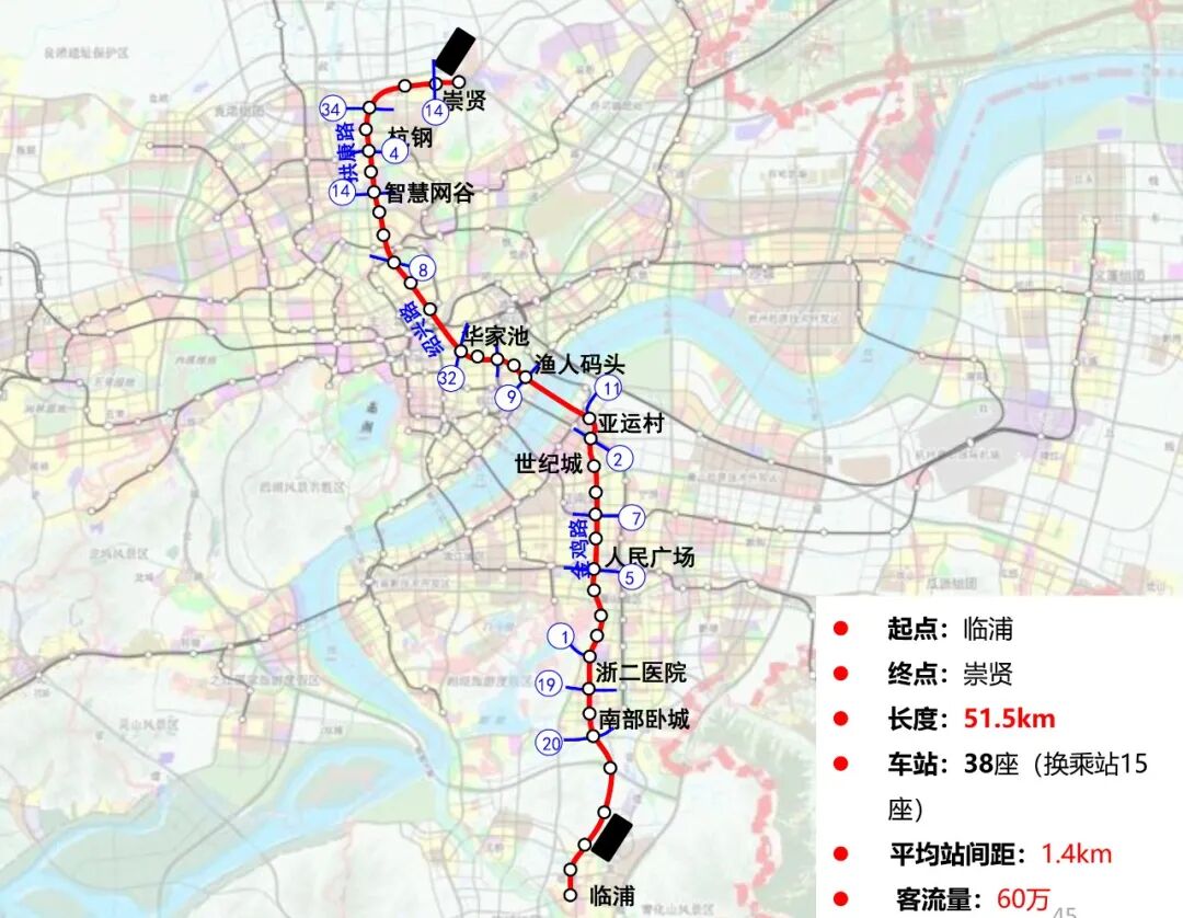 起于崇贤地区,止于萧山临浦,全长51.5公里,设站38座。支持大城北地区发展,解决大城北南北向轨道交通薄弱问题,实现与CAZ的便捷联系;强化市级中心(钱江新城和钱江世纪城)的辐射力,进一步加强对大城北、临浦等地区的带动;填补轨道服务薄弱区,加强绍兴路沿线、省妇保、浙二医院等轨道需求较大区域服务;![]()