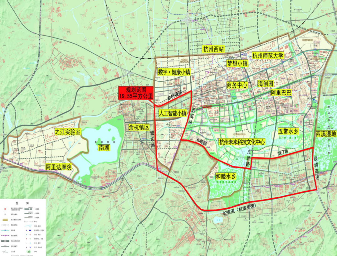 未来科技城南部片区:位于杭州市区西翼,余杭区西南部,城西科创大走廊中部,未来科技城南部,东接杭州主城区,北接闲林五常水乡、杭州未来科技文化中心和数字·健康小镇,南接02省道南侧居住区,西接老余杭集镇,包含五常产业区块、翡翠城等居住区块、和睦水乡区块、万金山居住区块、杭徽高速老余杭出入口区块、菜鸟网络总部及智慧产业园、人工智能小镇、5G创新园等,功能定位与城市形象急需研究提升,公共服务与基础配套急需校核梳理,生态环境与景观风貌急需保护管控,产业发展与文化彰显急需梳理统筹。