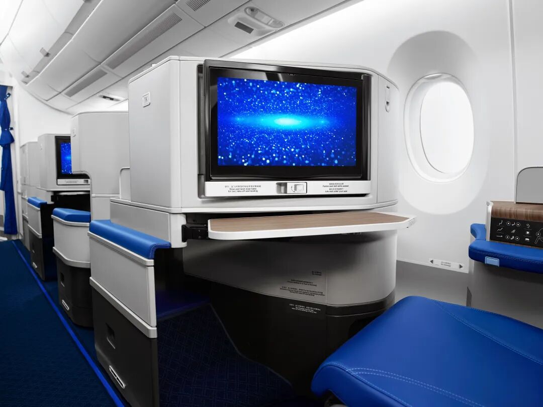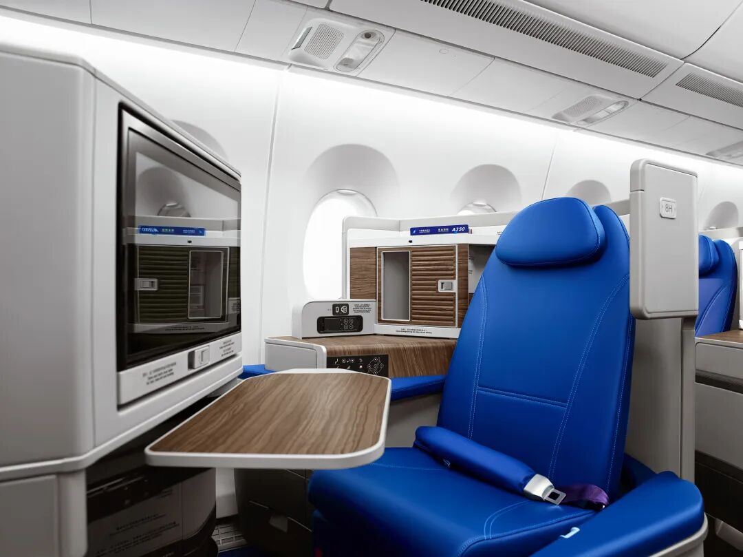 南航A350客机拥有总共314座,其中28座商务舱座位位于客舱最前方,每个座位配备18.5寸大型屏幕个人电视,座椅可调180度全平躺,舒适非常!